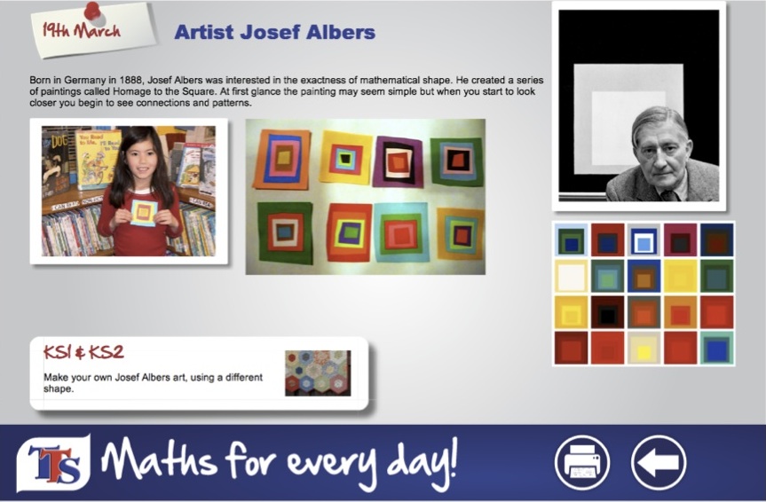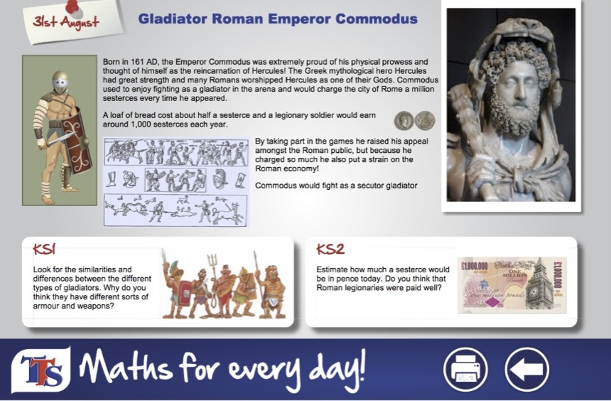 Maths is all around us, every day. This calendar gives 366 Maths starters for KS1 and KS2. The starters are linked to events from that day in history, including Egyptians, Romans, Tudors, Victorians, WWI, WWII, famous people, special numbers, art, science, poetry, literature and a whole lot more. Use on your whiteboard, on your PC or print the activities for children to be able to read and try.