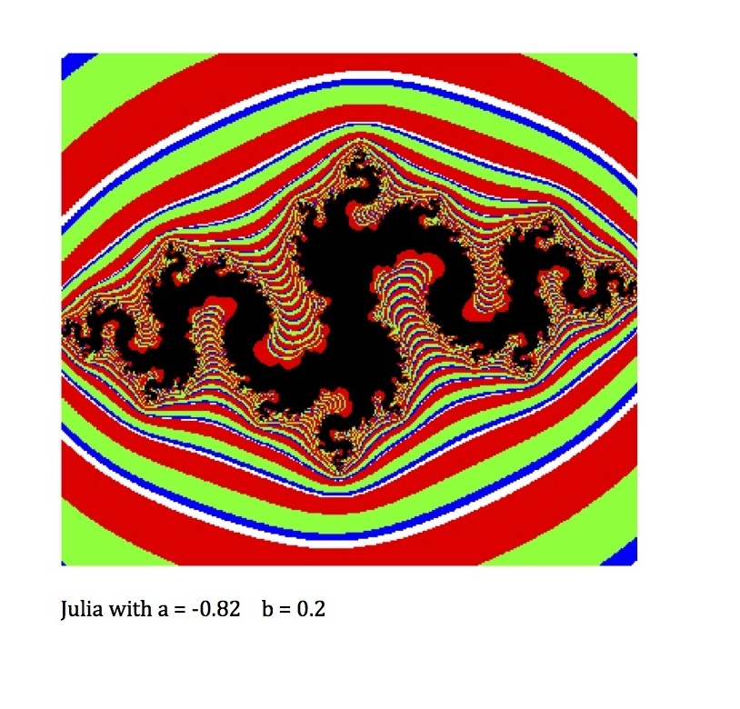 Create your own Julia patterns. Here is the code for this quadratic (x+iy)^2 + (a+ib) with a = -0.82 and b = 0.2